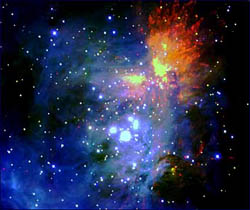 The Arms of Orion: An infrared image of the Orion nebula. At the center of the image is the Trapezium, a group of four bright stars. Many stars seen around the Trapezium are young stars embedded in the molecular cloud located behind the Orion nebula. Credit: Subaru Telescope, National Astronomical Observatory of Japan |